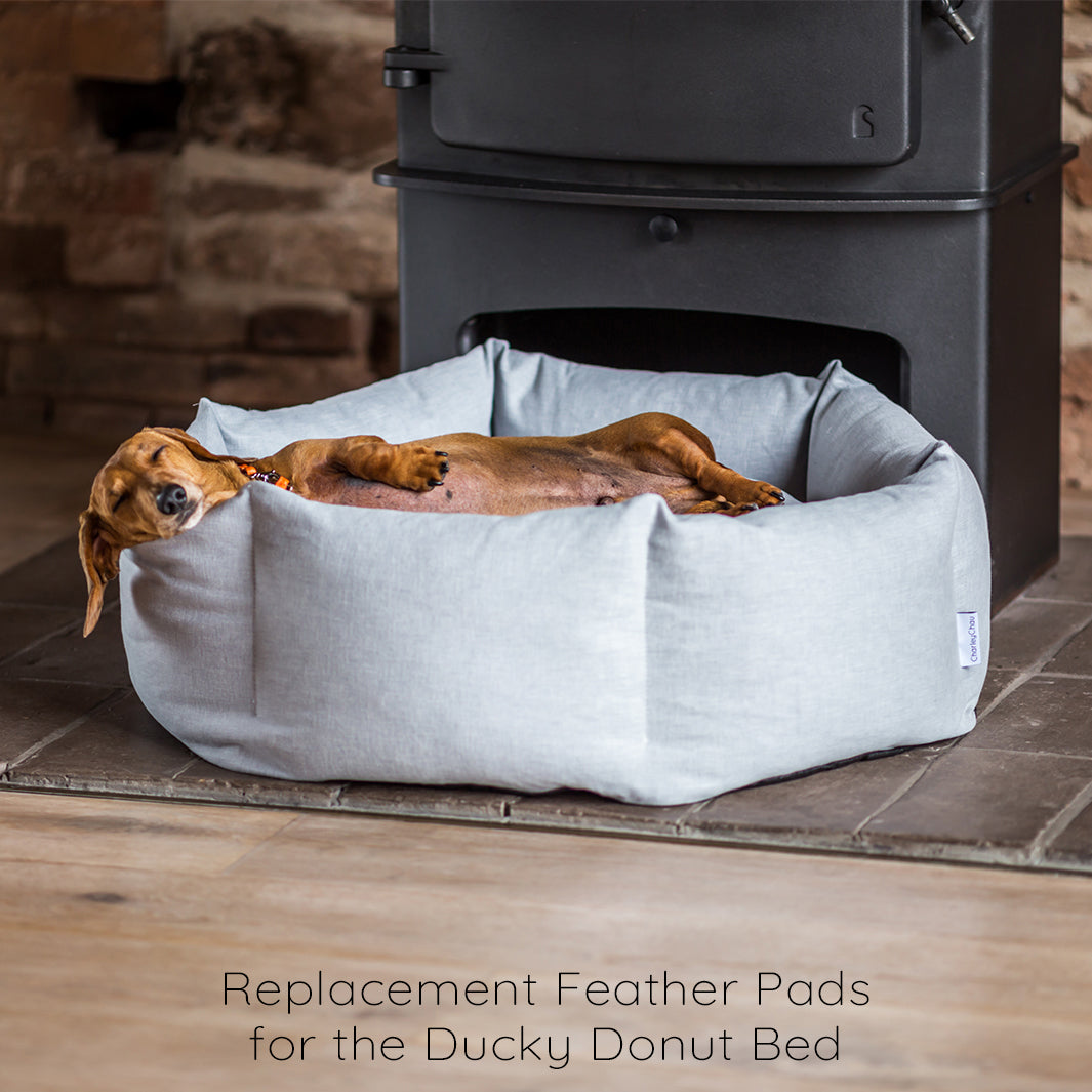 Replacement feather pads are available for our Ducky Donut Dog Beds, Bliss Bolster Beds and Mini Bolster Pads so you shouldn’t ever need to send a Charley Chau luxury dog bed to landfill.