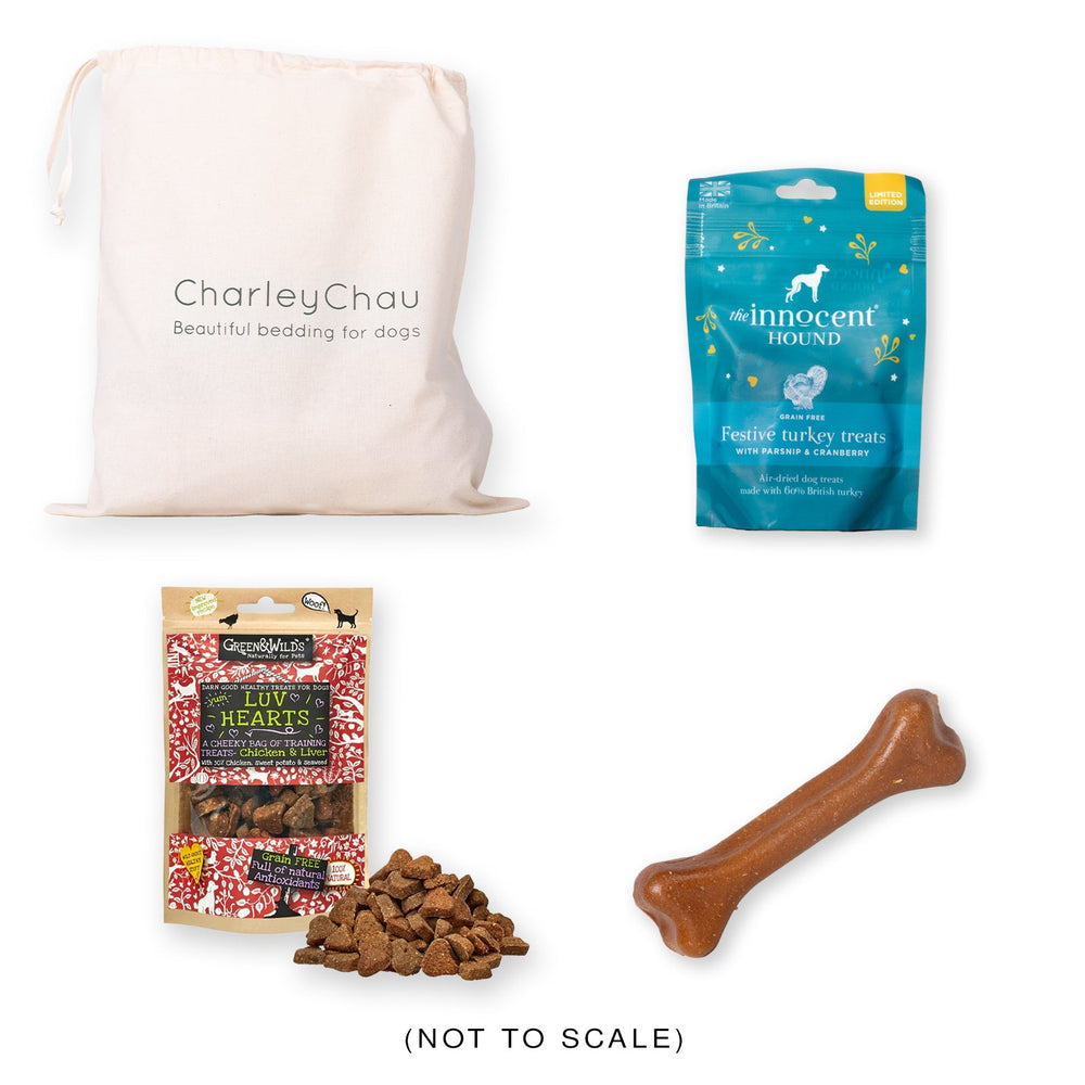 This fabulous Festive Treat Gift Bag includes a lovely selection of delicious and healthy treats and a long-lasting chew. The Gift Bag also includes our official Charley Chau Christmas Card for 2025 with a seasonal greeting for you to address to whomever you please, and presented in one of our handy Drawstring Cotton Gift Bags.