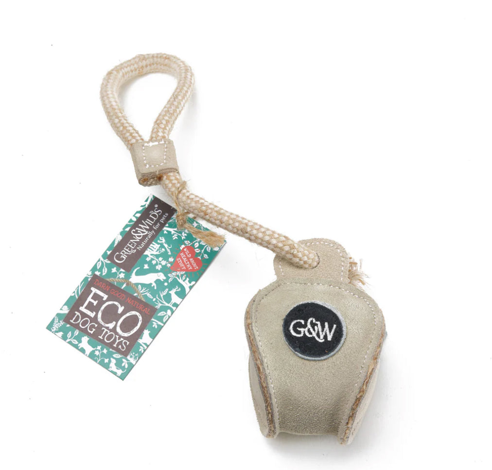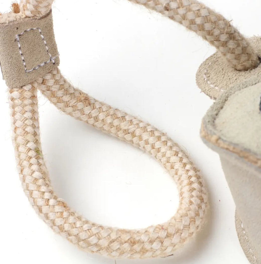 A smart, durable and planet friendly Chuck Ball on a Rope, built with four layers of tough jute, reinforced with recycled cotton and jute rope, and wrapped in soft suede.