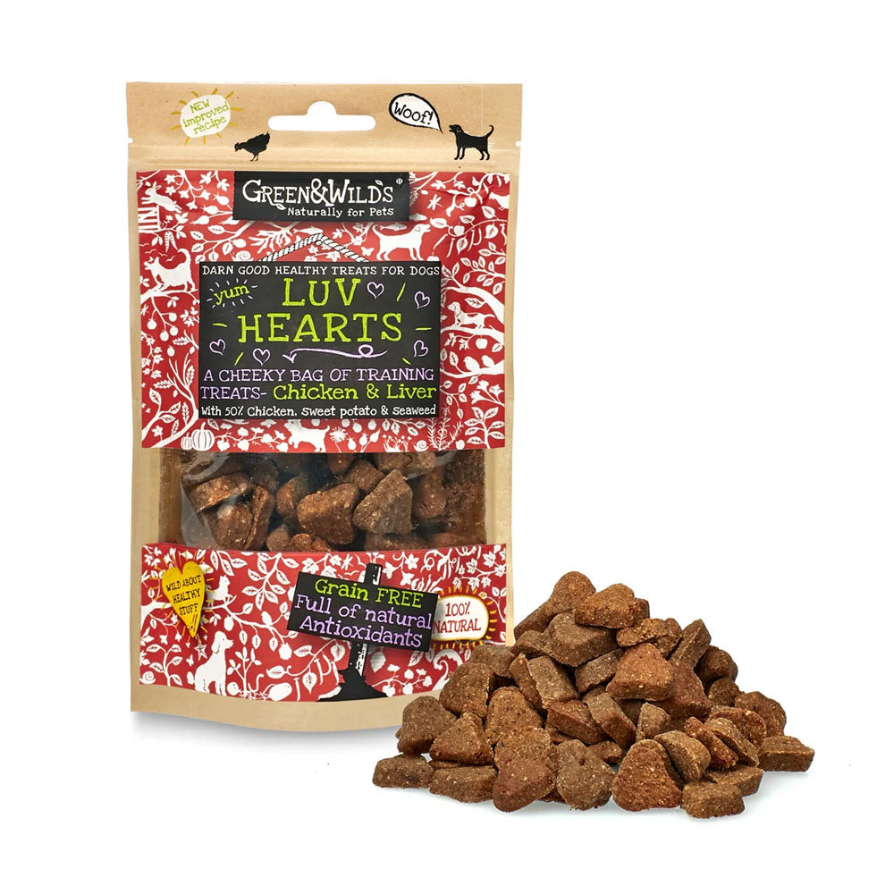 Bursting flavour, Green & Wild’s Luv Heart Treats are from the Green & Wild Bakery, made with real chicken, grain-free and with no artificial colours or flavours - perfect for sensitive tummies. Packed with natural antioxidants, iron-rich liver for digestion and immune support. Healthy and tasty in every bite. Each pack contains 100g of Luv Heart Treats.