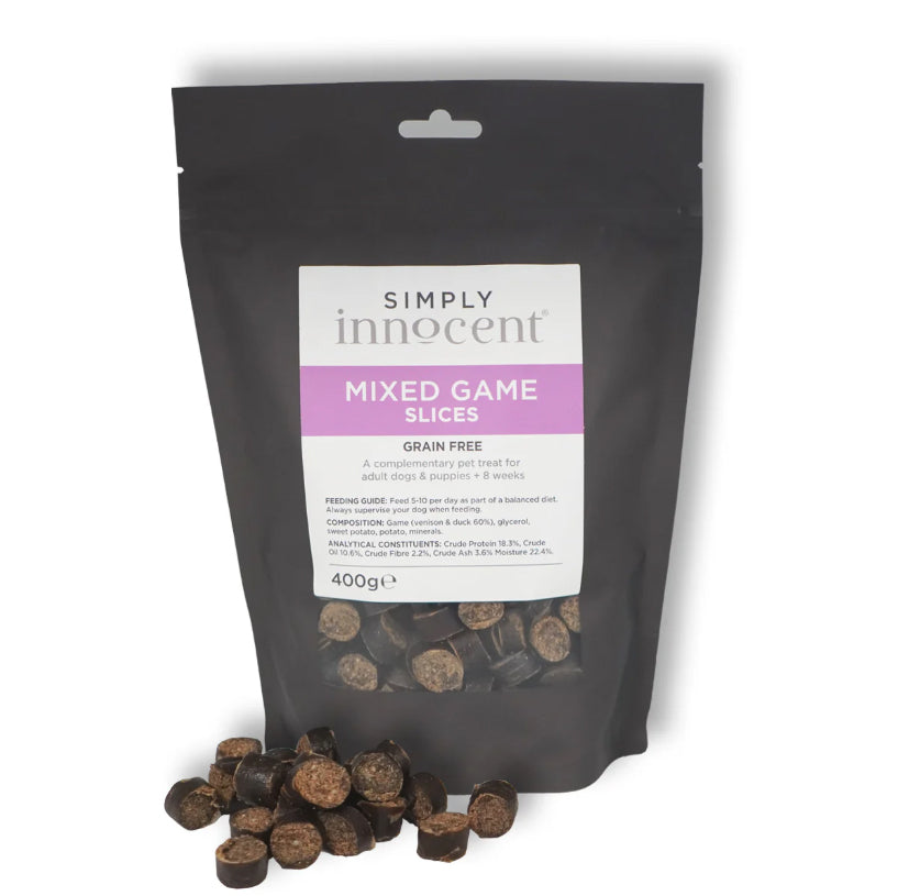 Treat your dog to luxury with Simply Innocent Mixed Game Slices, delicious ready-sliced venison and duck Sausages, made in Yorkshire with 60% British venison and duck. These grain-free, delicious and nutritious treats are perfect for training or rewarding.